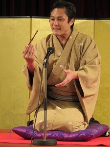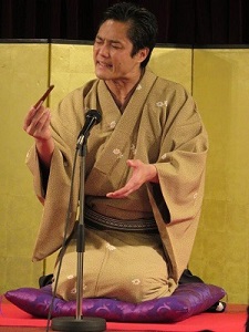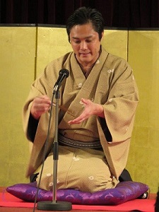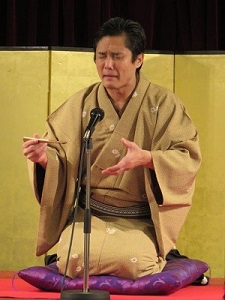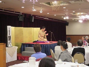 昼食後は、ゲストの三遊亭楽八さん(市川市南行徳在住)に落語を2席語って頂きました。楽八さんは、目の不自由な方にと、ご自身の着ている着物の 色や柄の説明、演目の中では、そばをすする音なども丁寧に音を大切に描写してくれました。会場全員が、笑いの渦にまきこまれ、とても楽しいひとときでした。