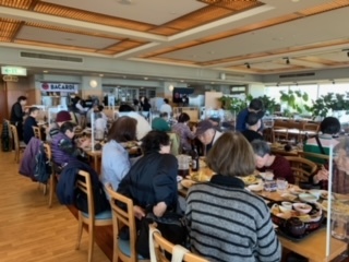 東金市の道の駅「みのりの郷」でのいちご狩りは、皆さんとても楽しみにされていました。 大きなビニールハウスの中は甘酸っぱい匂いに包まれ、棚に実っている6種類のいちごを 堪能しました。その後、隣りの道の駅で地元の野菜や果物などの買い物を楽しみ、バスは 「サンライズ九十九里」へ。昼食はこちらのレストランで美味しい海の幸をいただいて、40周年のお祝いをしました。