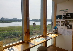 最初に、2階の近郊緑地を一望できるガラス張りの観察スペースで、 職員の方から今の季節に見られる鳥たちの話を伺いました。